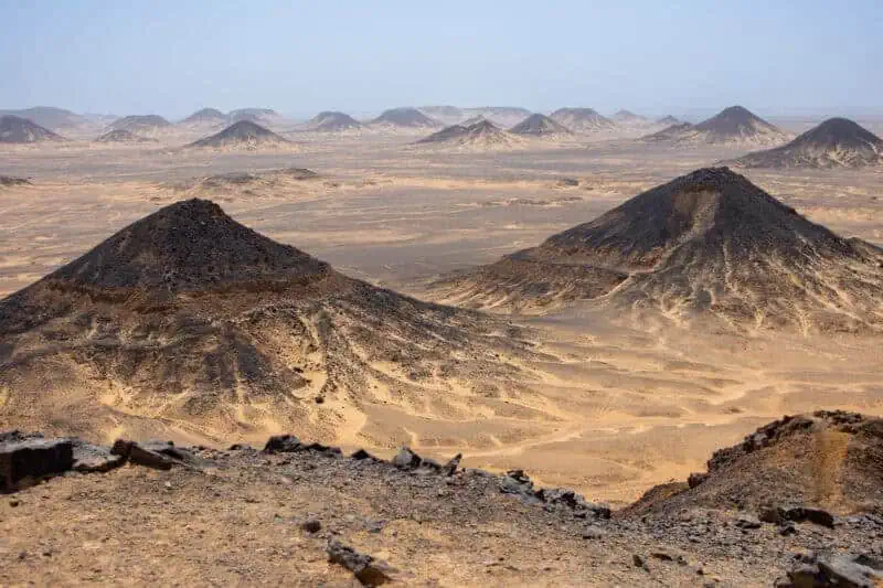 Il faut tout d’abord savoir que tu vas passer pas mal de temps en voiture pour découvrir le désert mais cela ne nous a pas pesé vu la beauté des paysages. Une fois arrivé à l’oasis de Bahariya, nous avons déjeuné, avec les autres tours, dans un restaurant très bon avant de partir à l’aventure. Même si nous sommes venus voir le désert blanc, le tour commence par le désert noir, une ancienne plaine volcanique ou les monticules sont recouverts de basaltes, d’où la couleur. Nous sommes montés sur une des collines pour admirer la vue… le tour commence vraiment bien.